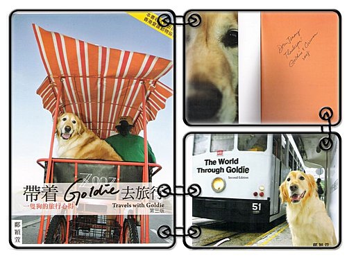 逛書展最高興的事,莫過於可以用便宜的價錢買到自己喜愛的書 要是能巧遇作者,幫你大筆一揮簽個名,那更令人興奮! 我在各大知名書攤逛過之後,走到樓上2號展場的一個小出版社前 一本封面是狗兒坐三輪車的書深深地吸引了我的視線—《帶著Goldie去旅行》 原來是一本描寫主人與狗兒共同遊歷的書籍 作者以狗兒Goldie的口吻,用細膩、深情且幽默的文字寫下他們的遊歷 足跡遍佈香港外,更遠及加拿大、美國 難怪去年甫出版,便成了暢銷書。 這樣的書,當然成了喜愛動物如我的藏書囉! 更令人高興的是,作者就在現場,當場大筆揮毫,為我簽字, 我也允諾一定交給她我的讀書心得。 拎著書袋,滿心歡喜地結束了一天的書展行。 今天的收穫真是豐富,回去的車上,忍不住再拿起Goldie細讀。 可愛的Goldie讓我一再忍俊不住笑出聲來,淚水也不顧旁人的注視一直流下。 除了向Goldie媽咪交心得報告外,我已決定要再親自登門拜訪他們了!!
