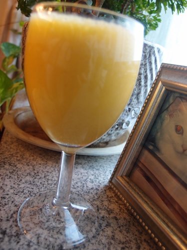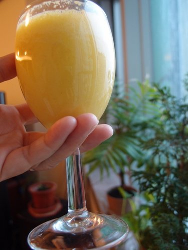 將柳橙、蘋果和胡蘿蔔混合在一起,猜會變成什麼顏色呢? 你一定毫不猶疑地會說橘紅色,不過,我調出的竟是美麗無比的金黃色!! 不喜歡吃胡蘿蔔的孩子,也會很高興地喝下這杯活力飲料。