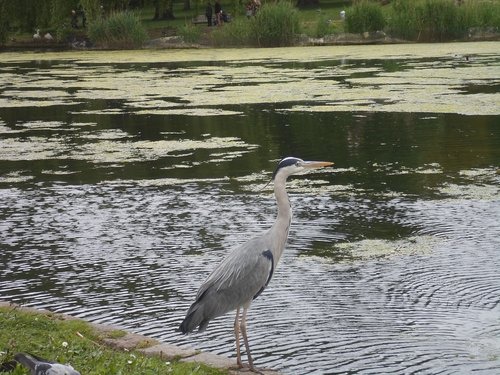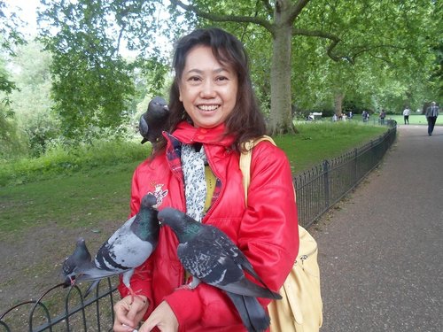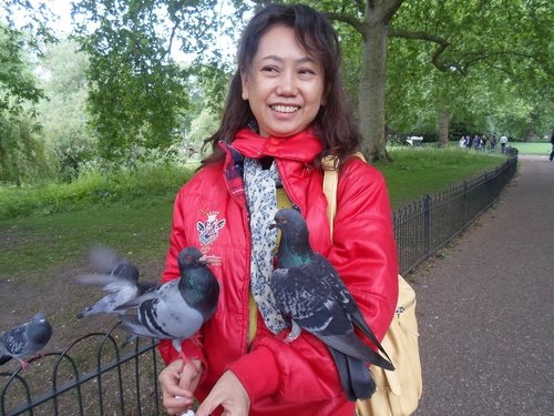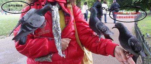 公園裡為數最多的鳥類,不說也知道,當然是鴿子!我一面走著,一面往嘴裡丟幾粒南瓜子。或許這吃瓜子的動作太吸引人,竟然引起鴿子們的注意,就在我吃的得意忘形時候,一隻隻飛鴿竟然用著迅雷不及掩耳的速度飛到我身上,大膽地在我的肩頭、臂膀、兩手,搜尋瓜子的蹤跡,肚子裡還發出咕嚕嚕的聲音。不管我怎麼快步走,這些鴿子始終緊緊攀附在我身上,好像成了我養的寵物一般。我趕緊將瓜子壓在手臂下面,避免被鴿子們找到。路過的遊人見狀,紛紛拿出相機拍照。我心裡可是一直在想,該怎麼甩開這些貪吃鬼。靈機一動,我用華爾滋步,身體來個大轉圈,又像魔術師一樣,兩臂奮力誇張的向外甩開,這一轉身、一甩手,竟然成功的甩開這一隻隻貪吃的鴿子。
