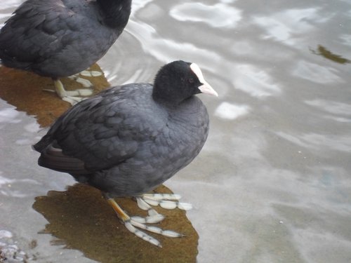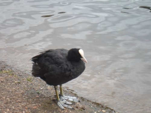 公園前方似乎有一個湖,我們決定往湖的方向去。沿著湖邊綠地有許多盛開的花朵,紅的、紫的,將岸邊點綴得十分多彩。湖裡有不少鷺鷥,細長的身形,姿態優雅。湖邊另外還有聚集了許多叫不出名字的鳥類,其中有一種水鳥,全身羽毛烏黑,唯有臉部長著一張白色小臉蛋,配上白色的鳥喙,說他是小白臉,真是一點也不為過,如果在鳥兒嘴尖點個小紅點,那簡直就像個唐朝的小美女。這白臉烏身的水鳥,體型和小母雞一般,爪上有蹼,想必是方便在水上划行。這群長相奇特的水鳥群聚在水邊,有的覓食、有的整理羽毛,俏模俏樣的,煞是可愛。
